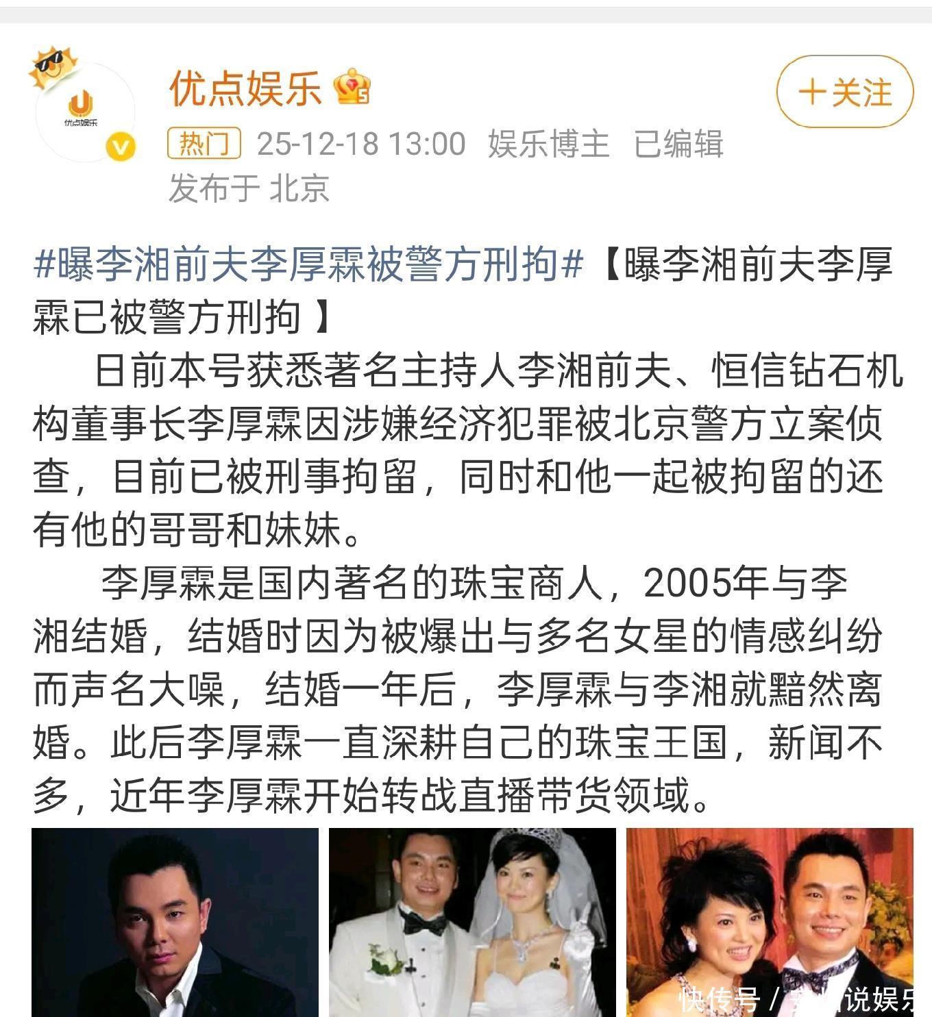 12月18日,关于李湘前夫“钻石大王”李厚霖被北京警方刑拘,还带着哥哥妹妹一起被抓,网传涉案欠债金额高达10多亿,在网上引起轩然大波。
